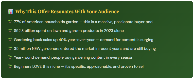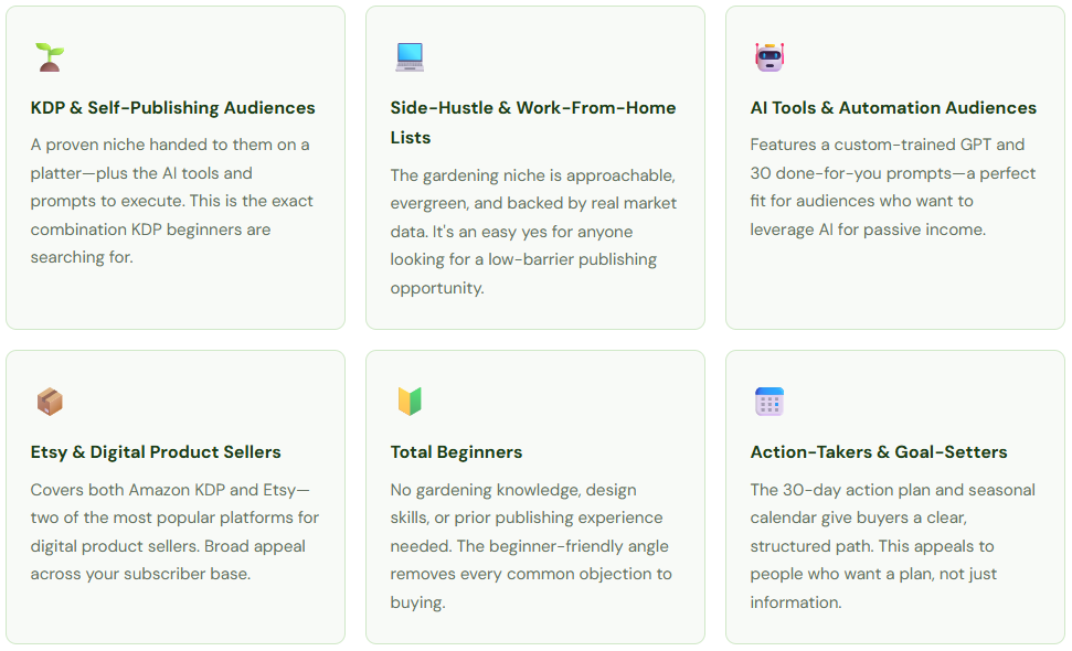 Garden Goldmine is engineered to appeal to the exact audiences most JV partners in this space have built. Here are the audiences this product appeals to: