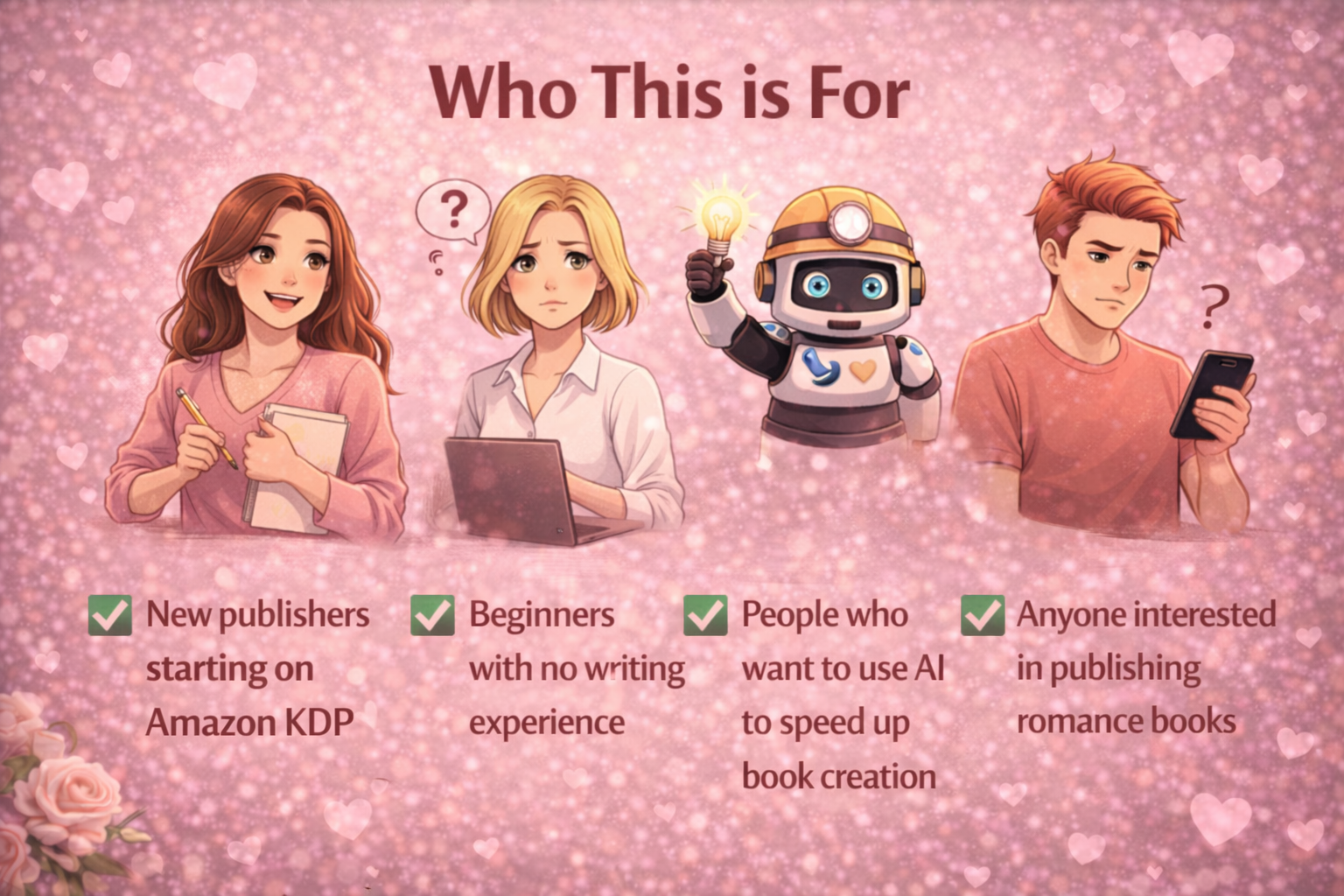 It combines a step-by-step guide with practical tools...like the Niche Validator GPT, Prompt Pack, and Action Plan...to help you identify promising niches, generate romance story concepts, and plan books that match what readers are actively looking for.